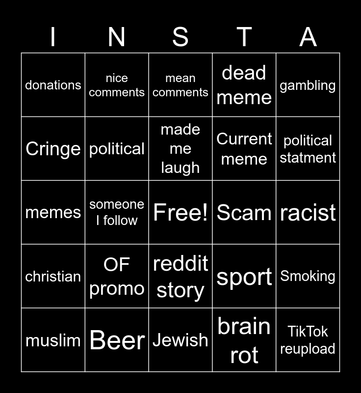 This bingo card has a free space and 24 words: OF promo, Beer, made me laugh, muslim, gambling, donations, Cringe, nice comments, Scam, reddit story, Current meme, memes, sport, Smoking, political, brain rot, racist, mean comments, political statment, someone I follow, TikTok reupload, christian, dead meme and Jewish.