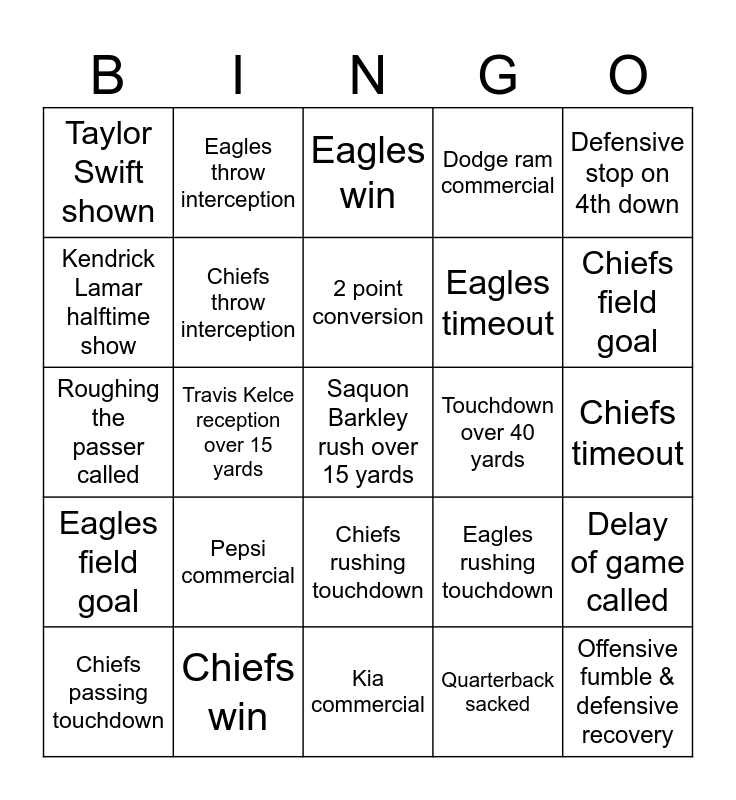 This bingo card has 1 images and 29 words: Chiefs passing touchdown, Eagles passing touchdown, 2 point conversion, False start, Defensive stop on 4th down, Taylor Swift shown, Eagles throw interception, Chiefs rushing touchdown, Touchdown over 40 yards, Offensive fumble & defensive recovery, Eagles field goal, Chiefs throw interception, Quarterback sacked, Delay of game called, Missed field goal, Travis Kelce reception over 15 yards, Saquon Barkley rush over 15 yards, Eagles rushing touchdown, Chiefs field goal, Roughing the passer called, Chiefs win, Eagles win, Eagles timeout, Chiefs timeout, Kendrick Lamar halftime show, Pepsi commercial, Kia commercial, Dodge ram commercial and Patrick mahomes commercial.
