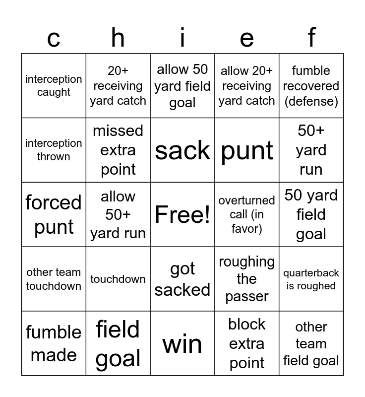 This bingo card has a free space and 24 words: touchdown, field goal, sack, fumble made, fumble recovered (defense), interception caught, interception thrown, 20+ receiving yard catch, overturned call (in favor), got sacked, punt, forced punt, roughing the passer, quarterback is roughed, missed extra point, block extra point, 50 yard field goal, allow 50 yard field goal, 50+ yard run, allow 50+ yard run, other team field goal, other team touchdown, allow 20+ receiving yard catch and win.