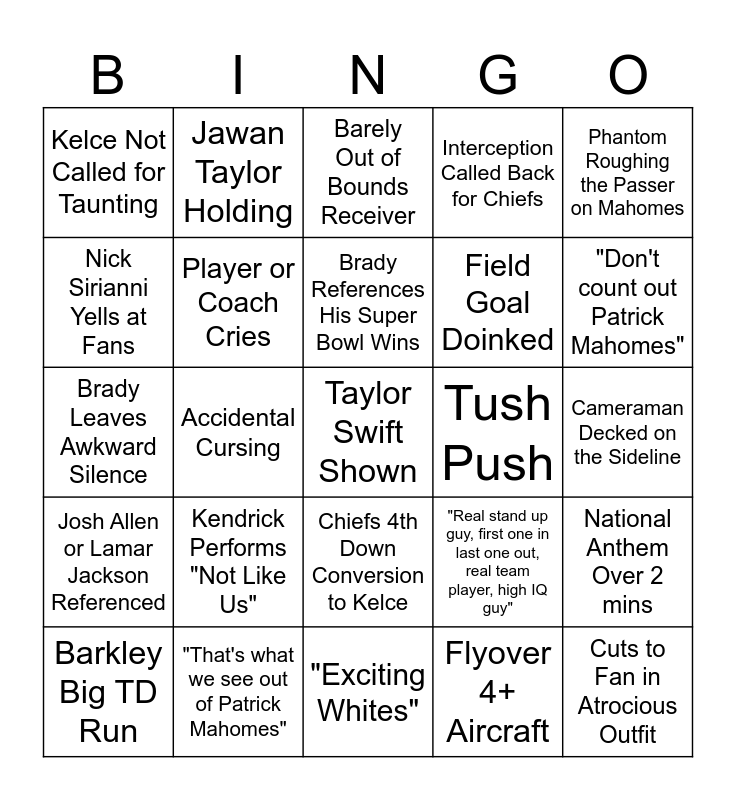 This bingo card has a free space and 24 words: Kendrick Performs "Not Like Us", "That's what we see out of Patrick Mahomes", Brady References His Super Bowl Wins, Barkley Big TD Run, Phantom Roughing the Passer on Mahomes, Kelce Not Called for Taunting, Nick Sirianni Yells at Fans, Jawan Taylor Holding, Tush Push, Chiefs 4th Down Conversion to Kelce, Field Goal Doinked, Brady Leaves Awkward Silence, "Real stand up guy, first one in last one out, real team player, high IQ guy", National Anthem Over 2 mins, Player or Coach Cries, Flyover 4+ Aircraft, Cameraman Decked on the Sideline, Barely Out of Bounds Receiver, "Don't count out Patrick Mahomes", Accidental Cursing, Cuts to Fan in Atrocious Outfit, Josh Allen or Lamar Jackson Referenced, Interception Called Back for Chiefs and "Exciting Whites".