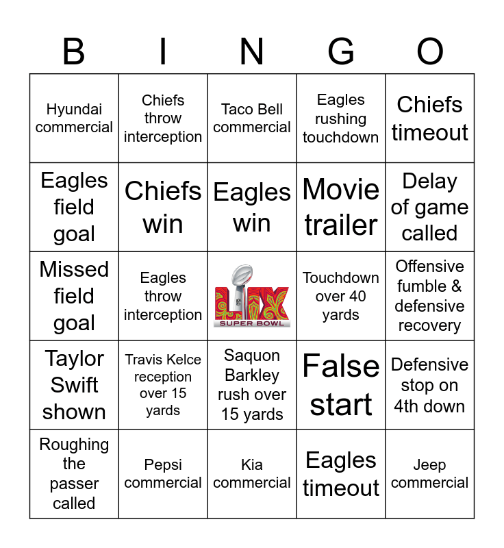 This bingo card has a free space and 39 words: Chiefs passing touchdown, Eagles passing touchdown, 2 point conversion, False start, Defensive stop on 4th down, Taylor Swift shown, Eagles throw interception, Chiefs rushing touchdown, Touchdown over 40 yards, Offensive fumble & defensive recovery, Eagles field goal, Chiefs throw interception, Quarterback sacked, Delay of game called, Missed field goal, Travis Kelce reception over 15 yards, Saquon Barkley rush over 15 yards, Eagles rushing touchdown, Chiefs field goal, Roughing the passer called, Chiefs win, Eagles win, Eagles timeout, Chiefs timeout, Kendrick Lamar halftime show, Pepsi commercial, Kia commercial, Dodge ram commercial, Patrick mahomes commercial, Hyundai commercial, Oreo commercial, State Farm commercial, Movie trailer, Jeep commercial, Budweiser commercial, Bud light commercial, Taco Bell commercial, Mtn dew commercial and Doritos commercial.