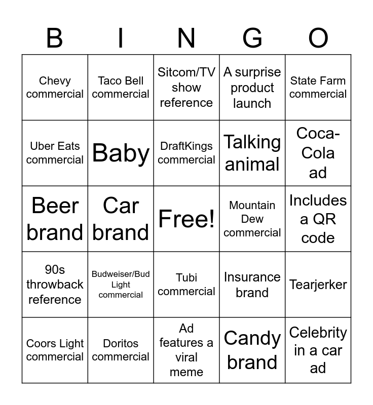 This bingo card has a free space and 24 words: Budweiser/Bud Light commercial, Doritos commercial, DraftKings commercial, Coors Light commercial, State Farm commercial, Chevy commercial, Uber Eats commercial, Taco Bell commercial, Mountain Dew commercial, Tubi commercial, Talking animal, Beer brand, Insurance brand, Tearjerker, Baby, Candy brand, Includes a QR code, Sitcom/TV show reference, Coca-Cola ad, Car brand, Celebrity in a car ad, 90s throwback reference, A surprise product launch and Ad features a viral meme.