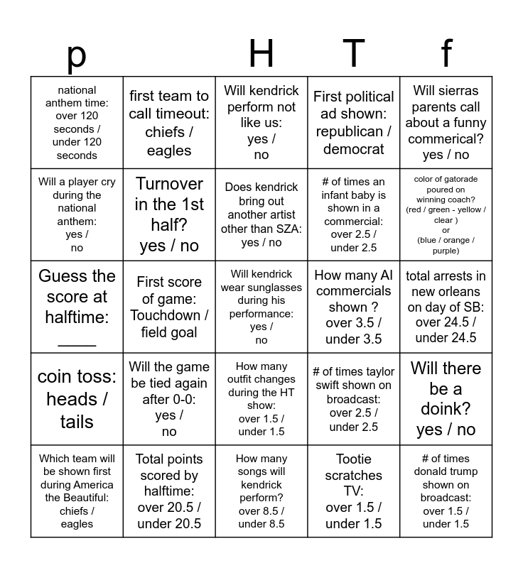 This bingo card has 25 words: coin toss: heads / tails, Total points scored by halftime: over 20.5 / under 20.5, Will kendrick wear sunglasses during his performance: yes / no, Tootie scratches TV: over 1.5 / under 1.5, Will sierras parents call about a funny commerical? yes / no, national anthem time: over 120 seconds / under 120 seconds, first team to call timeout: chiefs / eagles, Will kendrick perform not like us: yes / no, How many AI commercials shown ? over 3.5 / under 3.5, Will there be a doink? yes / no, Will a player cry during the national anthem: yes / no, Turnover in the 1st half? yes / no, How many songs will kendrick perform? over 8.5 / under 8.5, # of times taylor swift shown on broadcast: over 2.5 / under 2.5, color of gatorade poured on winning coach? (red / green - yellow / clear ) or (blue / orange / purple), Which team will be shown first during America the Beautiful: chiefs / eagles, First score of game: Touchdown / field goal, Does kendrick bring out another artist other than SZA: yes / no, # of times an infant baby is shown in a commercial: over 2.5 / under 2.5, total arrests in new orleans on day of SB: over 24.5 / under 24.5, Guess the score at halftime: ____, Will the game be tied again after 0-0: yes / no, How many outfit changes during the HT show: over 1.5 / under 1.5, First political ad shown: republican / democrat and # of times donald trump shown on broadcast: over 1.5 / under 1.5.