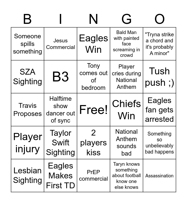 This bingo card has a free space and 24 words: Taylor Swift Sighting, Eagles Makes First TD, Tony comes out of bedroom, Lesbian Sighting, "Tryna strike a chord and it's probably A minor", Someone spills something, SZA Sighting, Jesus Commercial, Chiefs Win, 2 players kiss, Player cries during National Anthem, Travis Proposes, National Anthem sounds bad, Something so unbelievably bad happens, B3, Taryn knows something about football know one else knows, Eagles fan gets arrested, Eagles Win, Tush push ;), Halftime show dancer out of sync, Assassination, Player injury, Bald Man with painted face screaming in crowd and PrEP commercial.