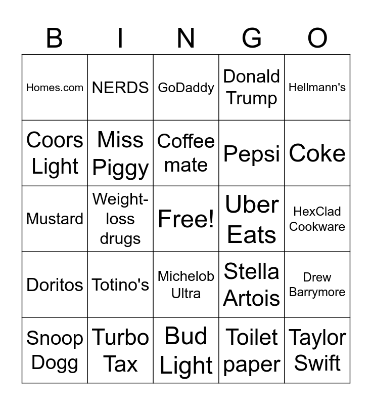 This bingo card has a free space and 39 words: FanDuel, Matthew McConaughey, Chris Pratt, Miss Piggy, Snoop Dogg, Michelob Ultra, Coffee mate, Pringles, Hellmann's, Doritos, Weight-loss drugs, Donald Trump, Taylor Swift, HexClad Cookware, Uber Eats, Totino's, Elon Musk, Homes.com, Little Caesars', Stella Artois, Coors Light, Bud Light, Pepsi, Coke, Oreos, Starbucks, Mountain Dew, Jesus, Frank's RedHot, NERDS, Marvel, Texas Pete, GoDaddy, Turbo Tax, Toilet paper, Rocket, Drew Barrymore, Mustard and Reese's.
