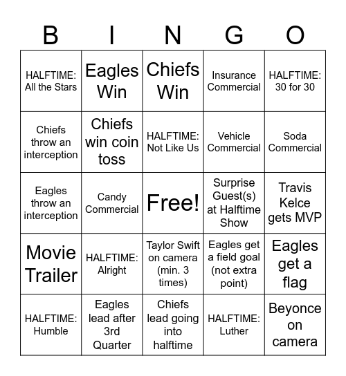 This bingo card has a free space and 24 words: HALFTIME: Humble, HALFTIME: Alright, HALFTIME: Not Like Us, HALFTIME: Luther, HALFTIME: 30 for 30, HALFTIME: All the Stars, Eagles Win, Chiefs Win, Surprise Guest(s) at Halftime Show, Travis Kelce gets MVP, Eagles throw an interception, Chiefs win coin toss, Eagles get a field goal (not extra point), Eagles get a flag, Chiefs throw an interception, Eagles lead after 3rd Quarter, Chiefs lead going into halftime, Insurance Commercial, Soda Commercial, Movie Trailer, Candy Commercial, Taylor Swift on camera (min. 3 times), Vehicle Commercial and Beyonce on camera.