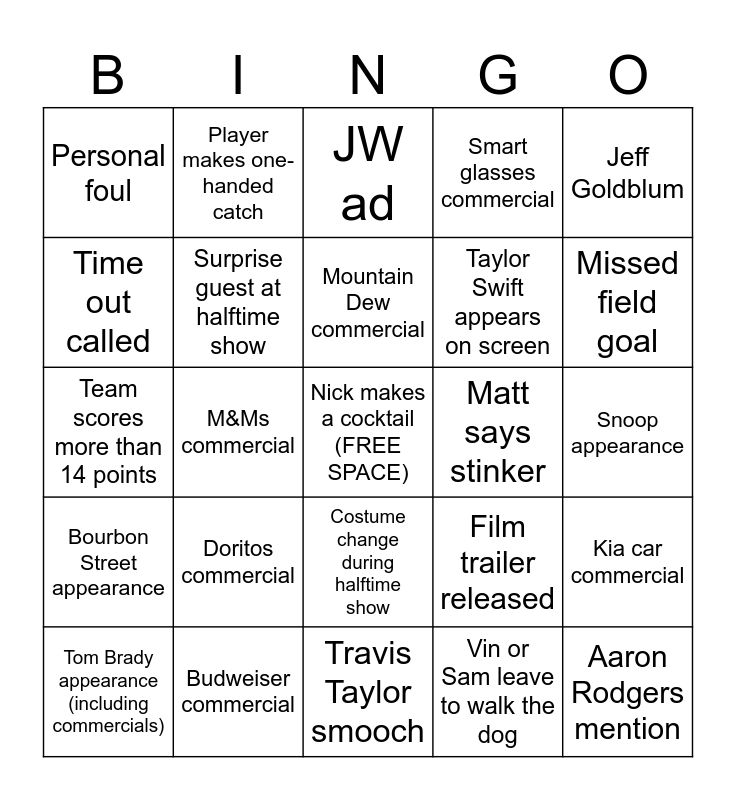 This bingo card has a free space and 24 words: Doritos commercial, Budweiser commercial, Mountain Dew commercial, Tom Brady appearance (including commercials), Jeff Goldblum, Personal foul, Time out called, Player makes one-handed catch, Matt says stinker, Costume change during halftime show, Taylor Swift appears on screen, Team scores more than 14 points, Film trailer released, Kia car commercial, Surprise guest at halftime show, Vin or Sam leave to walk the dog, Snoop appearance, JW ad, Missed field goal, M&Ms commercial, Aaron Rodgers mention, Bourbon Street appearance, Smart glasses commercial and Travis Taylor smooch.