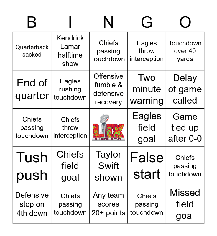 This bingo card has a free space and 39 words: Chiefs passing touchdown, Eagles passing touchdown, Chiefs rushing touchdown, Eagles rushing touchdown, Defensive stop on 4th down, Taylor Swift shown, Offensive fumble & defensive recovery, 2 point conversion, Touchdown over 40 yards, Tush push, Chiefs throw interception, Eagles throw interception, Missed field goal, Game tied up after 0-0, Eagles field goal, Chiefs field goal, End zone dance, Quarterback sacked, Challenge flag thrown, False start, End of quarter, Any team scores 20+ points, Two minute warning, Delay of game called, Roughing the passer called, Travis Kelce reception over 15 yards, Saquon Barkley rush over 15 yards, Eagles timeout, Chiefs timeout, Kendrick Lamar halftime show, Chiefs win, Eagles win, Chiefs passing touchdown, Chiefs passing touchdown, Chiefs passing touchdown, Chiefs passing touchdown, Chiefs passing touchdown, Chiefs passing touchdown and Chiefs passing touchdown.