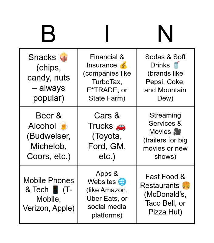 This bingo card has 9 words: Mobile Phones & Tech π± (T-Mobile, Verizon, Apple), Sodas & Soft Drinks π₯€ (brands like Pepsi, Coke, and Mountain Dew), Financial & Insurance π° (companies like TurboTax, E*TRADE, or State Farm), Beer & Alcohol πΊ (Budweiser, Michelob, Coors, etc.), Snacks πΏ (chips, candy, nuts β always popular), Streaming Services & Movies π₯ (trailers for big movies or new shows), Cars & Trucks π (Toyota, Ford, GM, etc.), Fast Food & Restaurants π (McDonaldβs, Taco Bell, or Pizza Hut) and Apps & Websites π (like Amazon, Uber Eats, or social media platforms).
