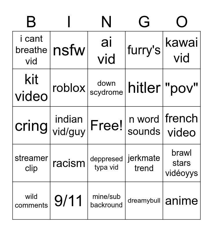 This bingo card has a free space and 24 words: racism, 9/11, down scydrome, wild comments, kawai vid, i cant breathe vid, kit video, nsfw, n word sounds, deppresed typa vid, hitler, cring, jerkmate trend, brawl stars vidéoyys, roblox, dreamybull, french video, ai vid, "pov", indian vid/guy, anime, streamer clip, furry's and mine/sub backround.
