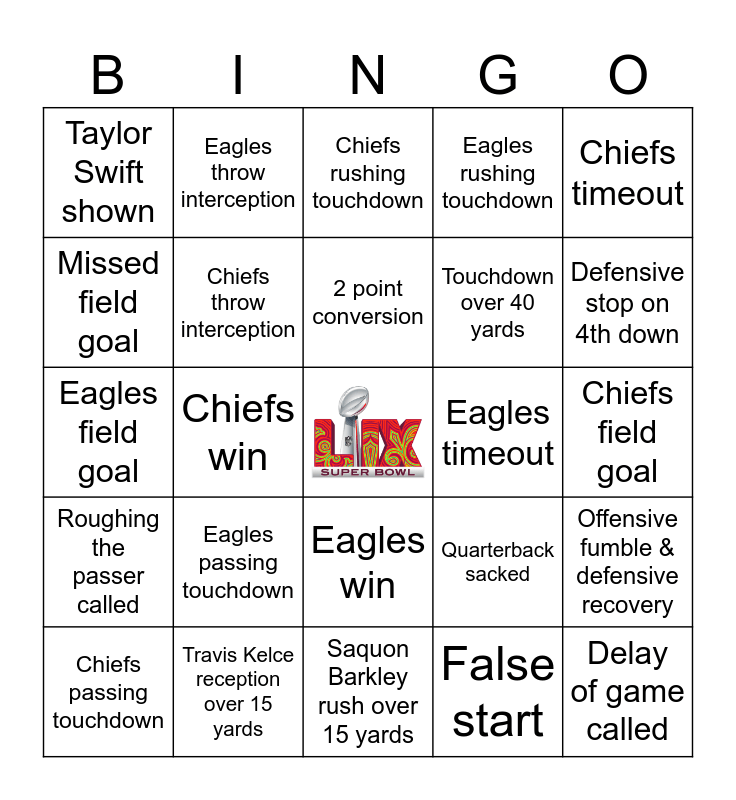 This bingo card has a free space and 25 words: Chiefs passing touchdown, Eagles passing touchdown, 2 point conversion, False start, Defensive stop on 4th down, Taylor Swift shown, Eagles throw interception, Chiefs rushing touchdown, Touchdown over 40 yards, Offensive fumble & defensive recovery, Eagles field goal, Chiefs throw interception, Quarterback sacked, Delay of game called, Missed field goal, Travis Kelce reception over 15 yards, Saquon Barkley rush over 15 yards, Eagles rushing touchdown, Chiefs field goal, Roughing the passer called, Chiefs win, Eagles win, Eagles timeout, Chiefs timeout and Kendrick Lamar halftime show.