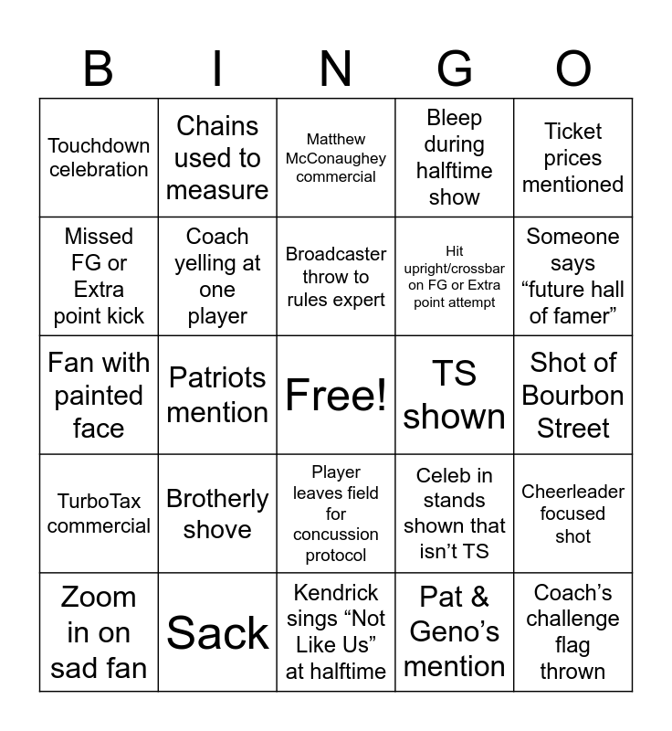 This bingo card has a free space and 24 words: Brotherly shove, Sack, Broadcaster throw to rules expert, Zoom in on sad fan, Ticket prices mentioned, Touchdown celebration, Missed FG or Extra point kick, Chains used to measure, TS shown, Player leaves field for concussion protocol, Hit upright/crossbar on FG or Extra point attempt, Fan with painted face, Celeb in stands shown that isn’t TS, Cheerleader focused shot, Coach yelling at one player, Pat & Geno’s mention, Shot of Bourbon Street, Matthew McConaughey commercial, Someone says “future hall of famer”, Patriots mention, Coach’s challenge flag thrown, TurboTax commercial, Bleep during halftime show and Kendrick sings “Not Like Us” at halftime.