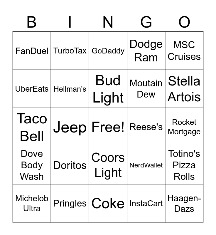 This bingo card has a free space and 24 words: Doritos, Pringles, Bud Light, Michelob Ultra, MSC Cruises, FanDuel, UberEats, TurboTax, Reese's, Coors Light, Moutain Dew, Taco Bell, NerdWallet, Totino's Pizza Rolls, Hellman's, InstaCart, Rocket Mortgage, GoDaddy, Stella Artois, Jeep, Haagen-Dazs, Dove Body Wash, Dodge Ram and Coke.