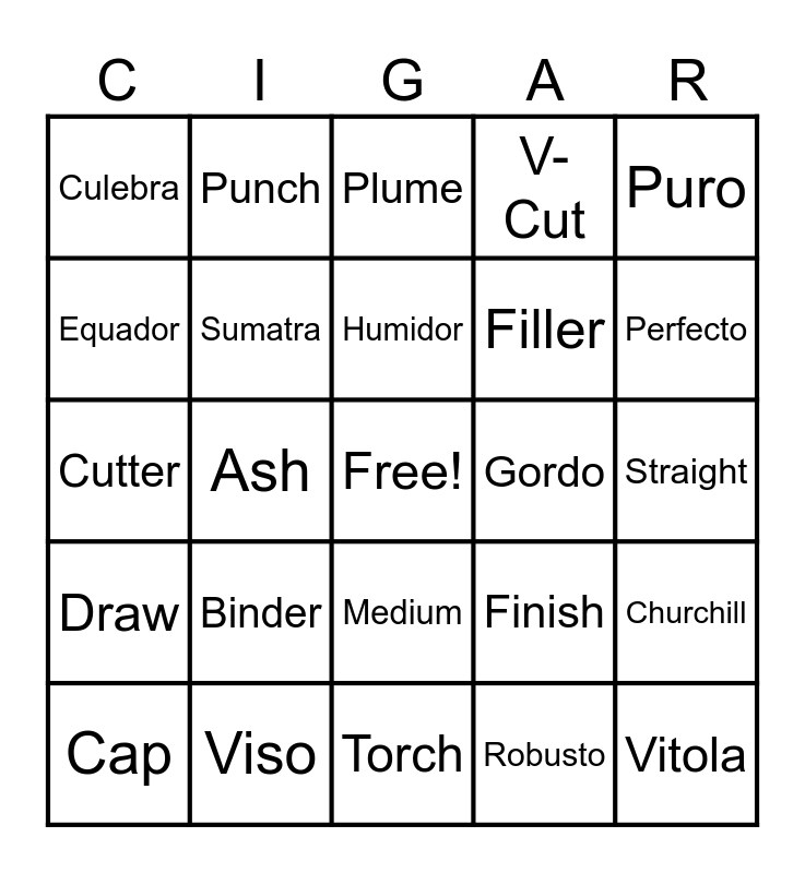 This bingo card has a free space and 39 words: Lancero, Full, Wrapper, Finish, Churchill, Draw, Ash, Ligero, Gordo, Straight, Equador, Punch, Maduro, Perfecto, Cutter, Binder, Medium, V-Cut, Corona, Cap, Sumatra, Humidor, Robusto, Puro, Toro, Viso, Torch, Candela, Blend, Culebra, Torpedo, Nicaragua, Filler, Vitola, Habano, Dominican Republic, Plume, Box-Pressed and Puro.