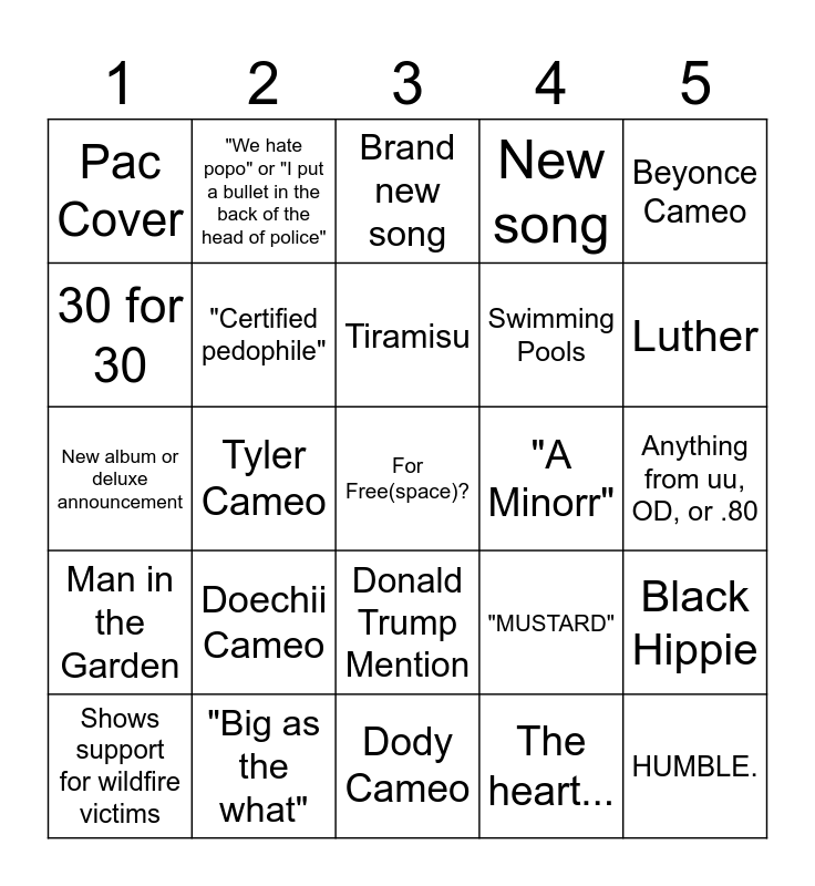 This bingo card has a free space and 24 words: Doechii Cameo, "Big as the what", Tiramisu, Shows support for wildfire victims, Beyonce Cameo, Pac Cover, 30 for 30, "We hate popo" or "I put a bullet in the back of the head of police", "A Minorr", Donald Trump Mention, Swimming Pools, New album or deluxe announcement, "MUSTARD", Black Hippie, "Certified pedophile", The heart..., Anything from uu, OD, or .80, Brand new song, Luther, Tyler Cameo, HUMBLE., Man in the Garden, New song and Dody Cameo.
