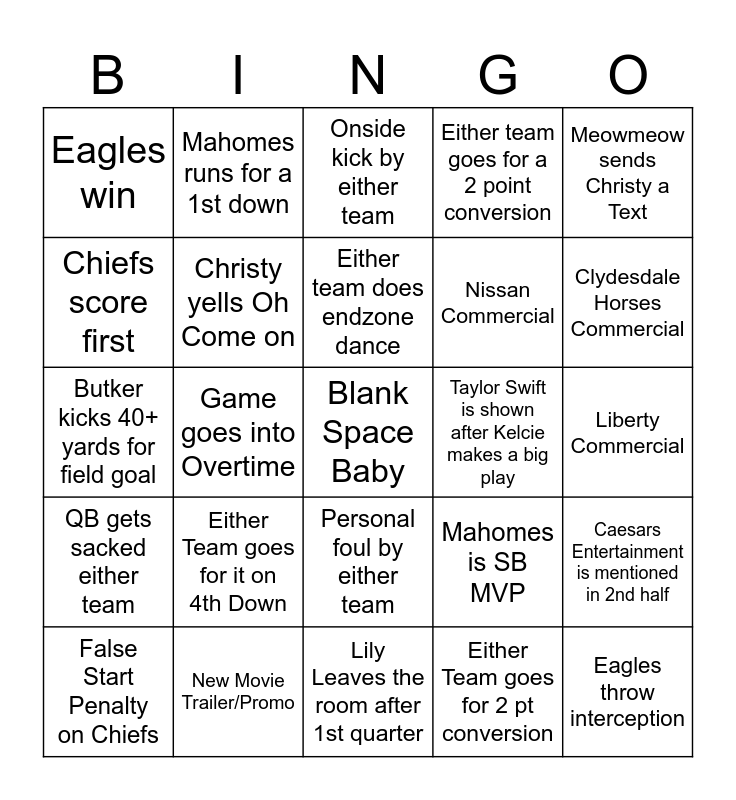 This bingo card has a free space and 49 words: Chiefs Win!, Eagles throw interception, Christy screams GO GO GO!, Lily Leaves the room after 1st quarter, Either Team goes for it on 4th Down, Chiefs win coin toss, Mahomes runs for a 1st down, Hunter mentions Joe Montana, Chiefs score first, Game goes into overtime, Christy yells Oh Come on, Either team goes for a 2 point conversion, Caesars Entertainment is mentioned in 2nd half, Mahomes is SB MVP, Hunter comments on KC refs, Christy screams Touchdown, Either team does endzone dance, Taylor Swift is shown after Kelcie makes a big play, Kendrick Lamar sings Not Like Us, Meowmeow sends Christy a Text, Game goes into Overtime, Either Team goes for 2 pt conversion, Eagles win, Nissan Commercial, Dominoes Commercial, Clydesdale Horses Commercial, False Start Penalty on Chiefs, False Start Penalty on Eagles, Personal foul by either team, QB gets sacked either team, Fumble resulting in Turnover, Reversed Call after challenge/review, Christy has Good Seizure, Mahomes scores touchdown, New Movie Trailer/Promo, J. Hurt scores a touchdown, State Farm Commercial, Progressive Commercial, Liberty Commercial, Chiefs throw interception, Pass interference, One Score Game, Game points total 40+, Hunt rushes for 1st down, Butker kicks 40+ yards for field goal, Onside kick by either team, Roughing the Passer called, Turnover on downs by eithe team and Either team missed field goal.