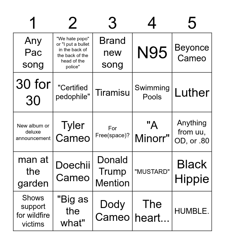 This bingo card has a free space and 24 words: Doechii Cameo, "Big as the what", Tiramisu, Shows support for wildfire victims, Beyonce Cameo, Any Pac song, 30 for 30, "We hate popo" or "I put a bullet in the back of the back of the head of the police", "A Minorr", Donald Trump Mention, Swimming Pools, New album or deluxe announcement, "MUSTARD", Black Hippie, "Certified pedophile", The heart..., Anything from uu, OD, or .80, Brand new song, Luther, Tyler Cameo, HUMBLE., man at the garden, N95 and Dody Cameo.