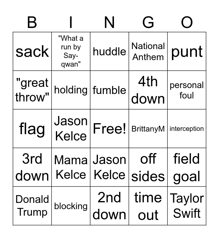 This bingo card has a free space and 29 words: touch down, blocking, huddle, tackle, punt, sack, holding, fumble, BrittanyM, field goal, Donald Trump, Jason Kelce, time out, Taylor Swift, flag, celebratory dance, 2nd down, off sides, personal foul, 3rd down, Mama Kelce, Beer commercial, 4th down, interception, "great throw", "What a run by Say-qwan", Jason Kelce, National Anthem and Another celebrity.