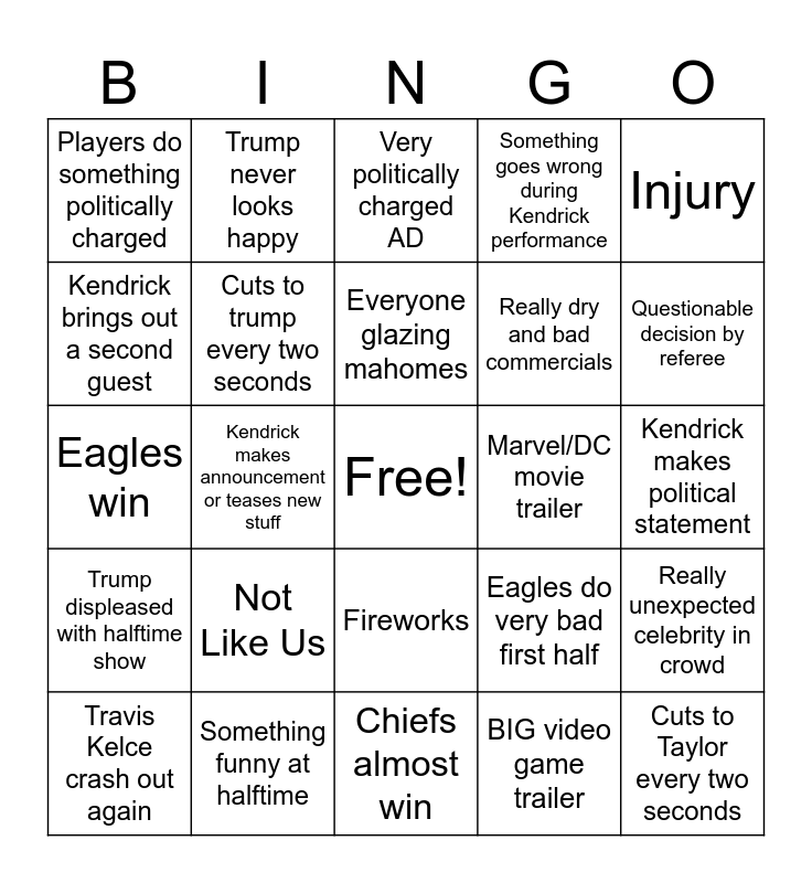 This bingo card has a free space and 24 words: Not Like Us, Something funny at halftime, Everyone glazing mahomes, Travis Kelce crash out again, Injury, Players do something politically charged, Kendrick brings out a second guest, Trump never looks happy, Marvel/DC movie trailer, Fireworks, Really dry and bad commercials, Eagles win, Eagles do very bad first half, Really unexpected celebrity in crowd, Cuts to trump every two seconds, BIG video game trailer, Kendrick makes political statement, Very politically charged AD, Questionable decision by referee, Kendrick makes announcement or teases new stuff, Cuts to Taylor every two seconds, Trump displeased with halftime show, Something goes wrong during Kendrick performance and Chiefs almost win.