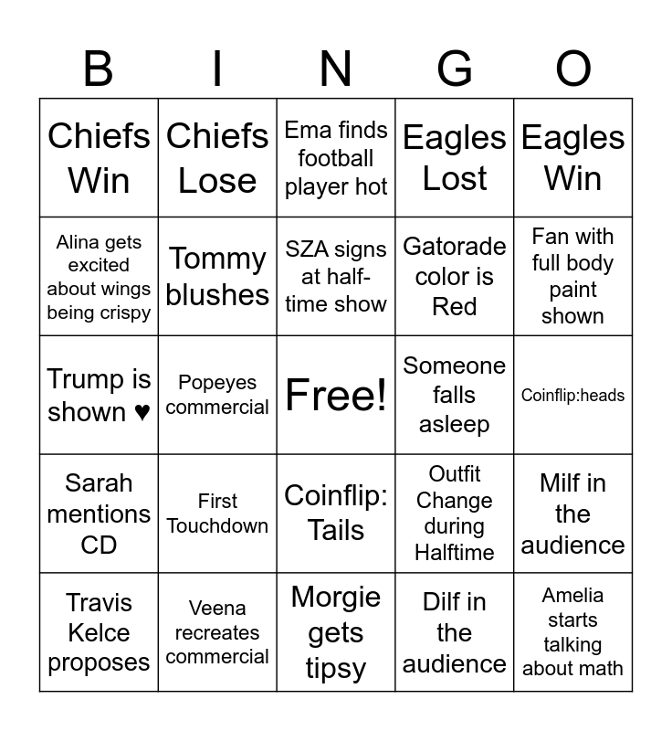 This bingo card has a free space and 24 words: First Touchdown, Veena recreates commercial, SZA signs at half-time show, Travis Kelce proposes, Eagles Win, Chiefs Win, Alina gets excited about wings being crispy, Chiefs Lose, Someone falls asleep, Coinflip: Tails, Gatorade color is Red, Trump is shown ♥, Outfit Change during Halftime, Milf in the audience, Tommy blushes, Dilf in the audience, Coinflip:heads, Ema finds football player hot, Fan with full body paint shown, Popeyes commercial, Amelia starts talking about math, Sarah mentions CD, Eagles Lost and Morgie gets tipsy.