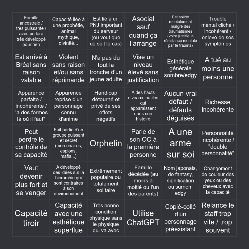 This bingo card has 36 words: Famille décédée (au moins à moitié ou l'un des parents), Extrêmement populaire ou totalement solitaire, Utilise ChatGPT, Est arrivé à Bréal sans raison valable, Peut perdre le contrôle de sa capacité, A des hauts niveaux inutiles qui apparaissent dans son histoire, Violent sans raison et/ou sans réprimande, Très bonne condition physique sans le physique qui va avec, Est solide mentalement malgré des traumatismes (voire justifie la résistance mentale par le trauma), Nom japonais, de fantasy, signification ou surnom edgy, A tué au moins une personne, Asocial sauf quand ça l’arrange, Changement de couleur des yeux ou des cheveux avec la capacité, Apparence reprise d'un personnage connu d'anime, Vise un niveau élevé sans justification, Famille ancestrale / très puissante / avec un lore très développé pour rien, Veut devenir plus fort et se venger, Aucun vrai défaut / défauts déguisés, Apparence parfaite / incohérente / "a des formes là où il faut", Est lié à un PNJ important du serveur (ou veut que ce soit le cas), Handicap détourné et privé de ses effets négatifs, Fait partie d’un groupe puissant et secret (mercenaires, espions, mafia...), Parle de son OC à la première personne, Orphelin, A une arme sur soi, Capacité liée à une prophétie, animal mythique, divinité..., Esthétique générale sombre/edgy, Capacité avec une esthétique superflue, N'a pas du tout la tronche d'un jeune adulte, Trouble mental cliché / incohérent / enlevé de ses symptômes, Relance le staff trop vite / trop souvent, Capacité tiroir, Personnalité incohérente / "double personnalité", Richesse incohérente, A développé des idées sur la hiérarchie qui sont contraires à son environnement and Copié-collé d’un personnage préexistant.