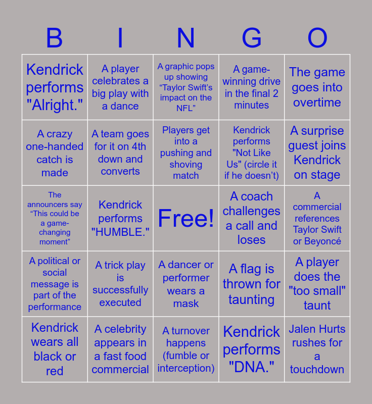 This bingo card has a free space and 49 words: Patrick Mahomes throws a touchdown pass, Jalen Hurts rushes for a touchdown, A field goal is missed, A turnover happens (fumble or interception), A trick play is successfully executed, Someone returns a kickoff or punt for 40+ yards, A player celebrates a big play with a dance, Someone spikes the ball with extra force, A crazy one-handed catch is made, A QB gets sacked HARD, A team goes for it on 4th down and converts, A game-winning drive in the final 2 minutes, A player does the "too small" taunt, A flag is thrown for taunting, A big pass interference penalty changes a drive, Someone on the field or sidelines yells at the refs, Players get into a pushing and shoving match, A coach challenges a call and loses, A bad call by the referees sparks controversy, The game goes into overtime, Kendrick performs "HUMBLE.", Kendrick performs "DNA.", Kendrick performs "Alright.", Kendrick performs "Not Like Us" (circle it if he doesn’t), Kendrick has at least one wardrobe change, A surprise guest joins Kendrick on stage, Kendrick wears all black or red, The set includes fire, pyrotechnics, or dramatic lighting, A dancer or performer wears a mask, A political or social message is part of the performance, A funny commercial makes you laugh out loud, A commercial makes you emotional, A commercial features a dog or cat, A commercial features a talking animal, A celebrity appears in a fast food commercial, A commercial features a nostalgic throwback (like a 90s/2000s reference), A commercial features a celebrity in a ridiculous costume, A car commercial has zero cars in it, A commercial references Taylor Swift or Beyoncé, A beer commercial includes a random heartwarming moment, Taylor Swift is shown on camera, A camera cuts to Travis Kelce after a big play, A fan in the stands is crying, A player gets caught mouthing a curse word on camera, The announcers say “This could be a game-changing moment”, A graphic pops up showing “Taylor Swift’s impact on the NFL”, Someone in the crowd holds a funny homemade sign, A celebrity (not Taylor) is shown unexpectedly and The announcers call someone “one of the greatest of all time”.