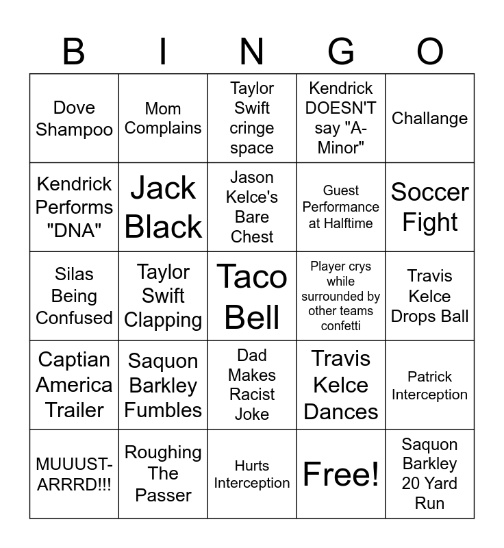 This bingo card has 30 words: Roughing The Passer, Tush Push, Taylor Swift Clapping, Group Touchdown Dance, Dove Shampoo, Taylor Swift cringe space, Jack Black, Dad Makes Racist Joke, Player crys while surrounded by other teams confetti, Hurts Interception, Travis Kelce Drops Ball, Taco Bell, Free!, Saquon Barkley 20 Yard Run, Soccer Fight, Doritoes, Travis Kelce Dances, Captian America Trailer, Saquon Barkley Fumbles, Challange, Silas Being Confused, Travis Kelce's Fat Brother is shown, Mom Complains, Guest Performance at Halftime, Kendrick Performs "DNA", Kendrick DOESN'T say "A-Minor", Patrick Interception, MUUUST- ARRRD!!!, Jason Kelce's Bare Chest and Taylor Sings Bad Blood (Won't happen, waste of space).