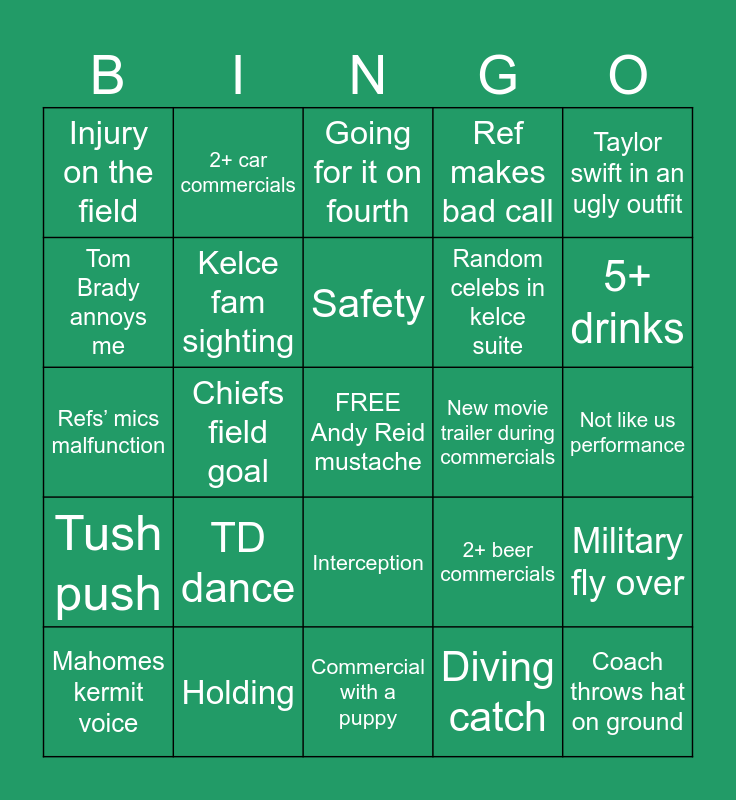 This bingo card has a free space and 39 words: Sack, Jalen hurts TD, Saquon slay, Kelce fam sighting, Mahomes kermit voice, Interception, Safety, Missed extra point/field goal, Taylor swift in an ugly outfit, Tush push, Chiefs field goal, Ref makes bad call, Coach throws hat on ground, Not like us performance, New movie trailer during commercials, TD dance, 40 yard+ rush, Injury on the field, SZA appearance, 2+ beer commercials, Tom Brady annoys me, Commercial with a puppy, Random celebs in kelce suite, 5+ drinks, Cry during a commercial, Mention of three-peat, Cursing gets past censors, Taunting, Unnecessary roughness, 2+ car commercials, Trick play, Eat a slice of pizza, Going for it on fourth, Holding, Diving catch, Pick six, Military fly over, Refs’ mics malfunction and Fans in face paint.