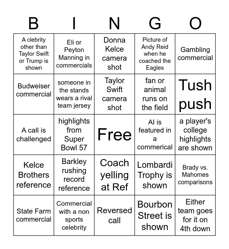 This bingo card has a free space and 24 words: Barkley rushing record reference, Commercial with a non sports celebrity, Taylor Swift camera shot, State Farm commercial, Gambling commercial, A clebrity other than Taylor Swift or Trump is shown, Budweiser commercial, Eli or Peyton Manning in commercials, AI is featured in a commerical, Coach yelling at Ref, fan or animal runs on the field, A call is challenged, Lombardi Trophy is shown, Brady vs. Mahomes comparisons, someone in the stands wears a rival team jersey, Bourbon Street is shown, a player's college highlights are shown, Donna Kelce camera shot, Tush push, highlights from Super Bowl 57, Either team goes for it on 4th down, Kelce Brothers reference, Picture of Andy Reid when he coached the Eagles and Reversed call.
