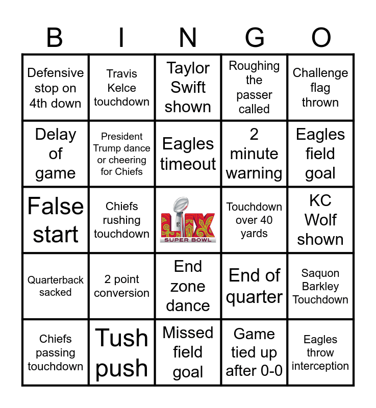 This bingo card has a free space and 29 words: Chiefs passing touchdown, Eagles passing touchdown, Chiefs rushing touchdown, Eagles rushing touchdown, Defensive stop on 4th down, Taylor Swift shown, President Trump dance or cheering for Chiefs, 2 point conversion, Touchdown over 40 yards, Tush push, KC Wolf shown, Eagles throw interception, Missed field goal, Game tied up after 0-0, Eagles field goal, Chiefs field goal, End zone dance, Quarterback sacked, Challenge flag thrown, False start, End of quarter, Any team scores 20 points, 2 minute warning, Delay of game, Roughing the passer called, Travis Kelce touchdown, Saquon Barkley Touchdown, Eagles timeout and Chiefs timeout.