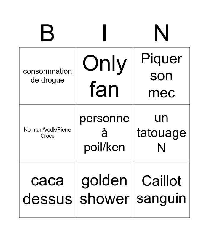 This bingo card has a free space and 8 words: un tatouage N, Piquer son mec, Only fan, caca dessus, consommation de drogue, Caillot sanguin, Norman/Vodk/Pierre Croce and golden shower.