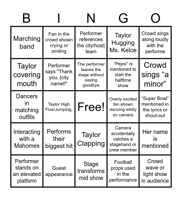 This bingo card has a free space and 28 words: Her name is mentioned, Everyone in the room agrees on who stole the show, “Pepsi” is mentioned to start the halftime show, Football props used in the performance, Taylor covering mouth, Performer references the city/host| team, Fan in the crowd shown crying or smiling, Interacting with a Mahomes, Overly excited fan shown dancing wildly on camera, Performer stands on an elevated platform, Dancers in matching outfits, Taylor Hugging Ms. Kelce, Guest appearance, Stage transforms mid show, Crowd sings “a minor”, NFL players dancing on the sidelines, Performs their biggest hit, Performer says "Thank you, [city namel!", The performer leaves the stage without saying goodbye, Taylor Clapping, Marching band, Pyrotechnics or fireworks, Crowd wave or light show in audience, Taylor High Five/Jumping,, “Super Bowl” mentioned in the lyrics or shout-out, Camera accidentally catches a stagehand or crew member, Crowd sings along loudly with the performe and Performer does an iconic pose or silhouette moment.