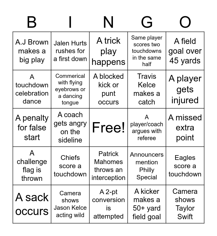 This bingo card has a free space and 24 words: Chiefs score a touchdown, Camera shows Jason Kelce acting wild, A blocked kick or punt occurs, A sack occurs, A field goal over 45 yards, A.J Brown makes a big play, A touchdown celebration dance, Jalen Hurts rushes for a first down, A player/coach argues with referee, Patrick Mahomes throws an interception, Travis Kelce makes a catch, A penalty for false start, Announcers mention Philly Special, Eagles score a touchdown, Commerical with flying eyebrows or a dancing tongue, A kicker makes a 50+ yard field goal, A missed extra point, A trick play happens, A player gets injured, A coach gets angry on the sideline, Camera shows Taylor Swift, A challenge flag is thrown, Same player scores two touchdowns in the same half and A 2-pt conversion is attempted.