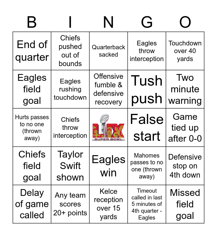 This bingo card has a free space and 38 words: Chiefs passing touchdown, Eagles passing touchdown, Chiefs rushing touchdown, Eagles rushing touchdown, Defensive stop on 4th down, Taylor Swift shown, Offensive fumble & defensive recovery, 2 point conversion, Touchdown over 40 yards, Tush push, Chiefs throw interception, Eagles throw interception, Missed field goal, Game tied up after 0-0, Eagles field goal, Chiefs field goal, End zone dance, Quarterback sacked, Challenge flag thrown, False start, End of quarter, Any team scores 20+ points, Two minute warning, Delay of game called, Roughing the passer called, Kelce reception over 15 yards, Saquon Barkley rush over 15 yards, Eagles timeout, Chiefs timeout, Kendrick Lamar halftime show, Chiefs win, Eagles win, Timeout called in last 5 minutes of 4th quarter - Eagles, Chiefs pushed out of bounds, Eagles pushed out of bounds, Mahomes passes to no one (thrown away), Hurts passes to no one (thrown away) and Refs make an obvious shitty call.