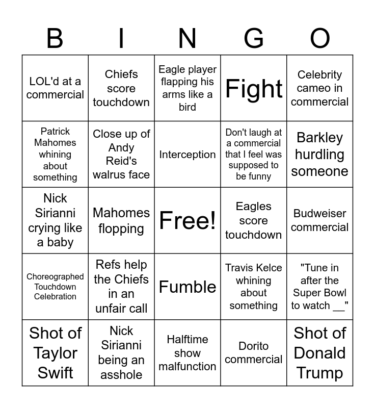 This bingo card has a free space and 24 words: Refs help the Chiefs in an unfair call, Nick Sirianni being an asshole, Interception, Shot of Taylor Swift, Celebrity cameo in commercial, LOL'd at a commercial, Patrick Mahomes whining about something, Chiefs score touchdown, Eagles score touchdown, Fumble, Don't laugh at a commercial that I feel was supposed to be funny, Nick Sirianni crying like a baby, Travis Kelce whining about something, "Tune in after the Super Bowl to watch __", Close up of Andy Reid's walrus face, Dorito commercial, Budweiser commercial, Eagle player flapping his arms like a bird, Barkley hurdling someone, Mahomes flopping, Shot of Donald Trump, Choreographed Touchdown Celebration, Fight and Halftime show malfunction.
