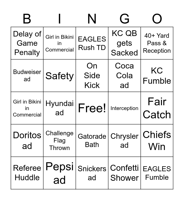 ⚠ This card has duplicate items: Extra Point Missed (2), Fumble (2), Interception (2), Safety (2), Delay of Game Penalty (2), Face Mask Penalty (2), Personal Foul Penalty (2), 4th Down Conversion (2), Failed 4th Down Conversion (2), Challenge Flag Thrown (2), Two Point Conversion (2), Kitten in Commercial (2), Puppy in Commercial (2), Clydesdale in Commercial (2), Talking Baby in Commercial (2), Talking Animal in Commercial (2), Girl in Bikini in Commercial (2), Body-Painted Fan (2), Face-Painted Fan (2), Hail Mary mentioned (2), Pass Interference (2), Fair Catch (2), Offside (2), On Side Kick (2), 40+ Yard Pass & Reception (2), KC Rush TD (2), KC Pass TD (2), KC Field Goal (2), KC Fumble (2), KC QB gets Sacked (2), EAGLES Rush TD (2), EAGLES Pass TD (2), EAGLES Field Goal (2), EAGLES Fumble (2), EAGLES QB Gets Sacked (2), Budweiser ad (2), Pepsi ad (2), Doritos ad (2), Chevy ad (2), Ford ad (2), Coca Cola ad (2), Hyundai ad (2), Chrysler ad (2), Snickers ad (2), Celeb in Crowd (2), Fan w/ Funny Sign (2), Sideline Knockdown (2), Referee Huddle (2), Gatorade Bath (2), Foam Finger (2), Confetti Shower (2), National Anthem (2), Field Goal Missed (2), Extra Point Made (2)