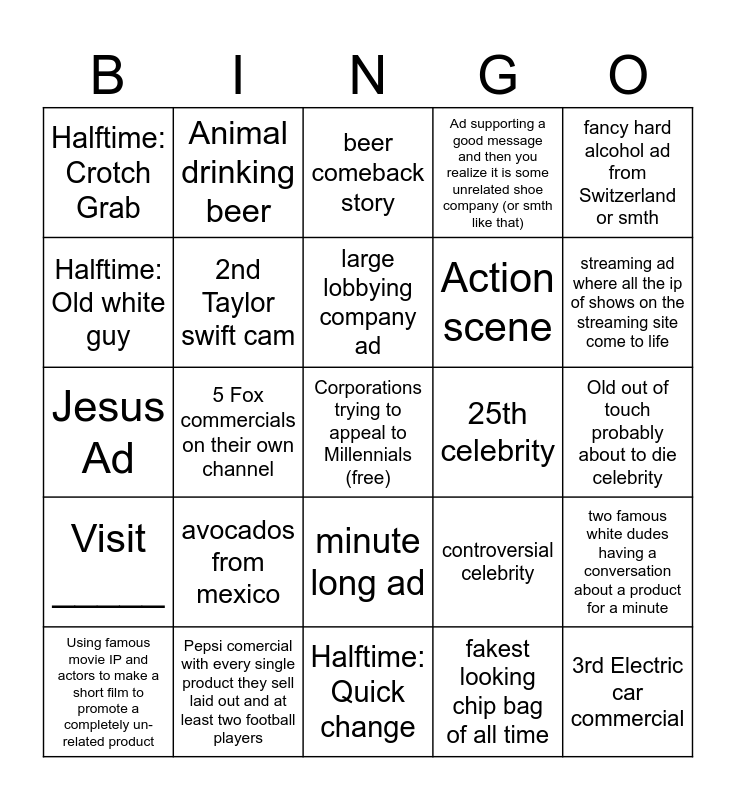 This bingo card has a free space and 39 words: Crypto Scam, Morgan Freeman, Famous footballer in weird costume, 2nd Taylor swift cam, Using famous movie IP and actors to make a short film to promote a completely un-related product, minute long ad, large lobbying company ad, Disney ad, fancy hard alcohol ad from Switzerland or smth, Visit _____, 5 Fox commercials on their own channel, Ad supporting a good message and then you realize it is some unrelated shoe company (or smth like that), 3rd Electric car commercial, Old out of touch probably about to die celebrity, 25th celebrity, avocados from mexico, 80s song, Halftime: Crotch Grab, Halftime: AAAA MIINNOORR, controversial celebrity, Halftime: Old white guy, Halftime: Quick change, Action scene, streaming ad where all the ip of shows on the streaming site come to life, Chinese company, AI Ad, Chip commercial with complete story line, "Inspirational" Travel company Ad, 3rd truck ad, Animal drinking beer, Bad singing in comercial, Dog in car commercial, beer comeback story, Pepsi comercial with every single product they sell laid out and at least two football players, fakest looking chip bag of all time, 4 footballers in the same commercial, two famous white dudes having a conversation about a product for a minute, Jesus Ad and Government sponsored Ad.
