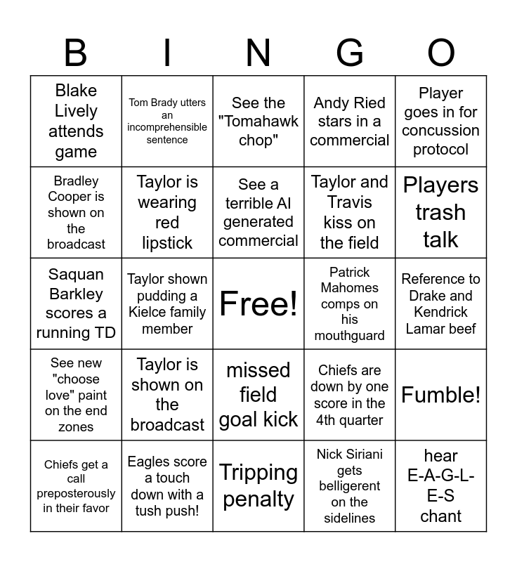 This bingo card has a free space and 24 words: Taylor is shown on the broadcast, Eagles score a touch down with a tush push!, See a terrible AI generated commercial, Chiefs get a call preposterously in their favor, Player goes in for concussion protocol, Blake Lively attends game, Bradley Cooper is shown on the broadcast, Tom Brady utters an incomprehensible sentence, Patrick Mahomes comps on his mouthguard, missed field goal kick, Taylor and Travis kiss on the field, Saquan Barkley scores a running TD, Chiefs are down by one score in the 4th quarter, Fumble!, Taylor is wearing red lipstick, Nick Siriani gets belligerent on the sidelines, Reference to Drake and Kendrick Lamar beef, See the "Tomahawk chop", Players trash talk, Taylor shown pudding a Kielce family member, hear E-A-G-L-E-S chant, See new "choose love" paint on the end zones, Andy Ried stars in a commercial and Tripping penalty.