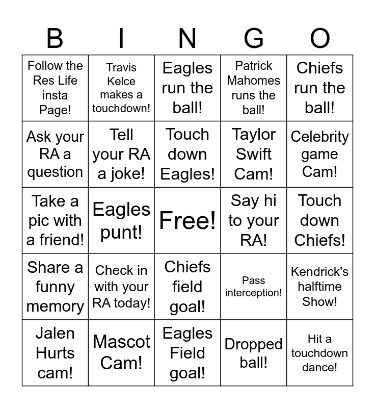 This bingo card has a free space and 24 words: Check in with your RA today!, Mascot Cam!, Touch down Eagles!, Jalen Hurts cam!, Chiefs run the ball!, Follow the Res Life insta Page!, Ask your RA a question, Travis Kelce makes a touchdown!, Say hi to your RA!, Chiefs field goal!, Taylor Swift Cam!, Take a pic with a friend!, Pass interception!, Kendrick's halftime Show!, Tell your RA a joke!, Dropped ball!, Touch down Chiefs!, Eagles run the ball!, Celebrity game Cam!, Eagles punt!, Hit a touchdown dance!, Share a funny memory, Patrick Mahomes runs the ball! and Eagles Field goal!.