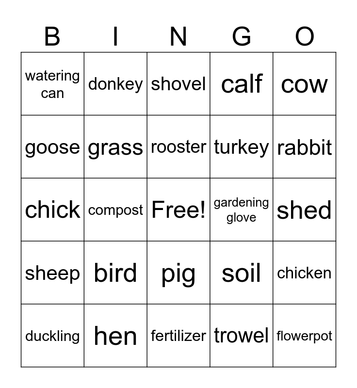 This bingo card has a free space and 31 words: fertilizer, hose, compost, field, watering can, shovel, grass, soil, gardening glove, trowel, shed, flowerpot, pruning shears, duck, rabbit, horse, chicken, bird, sheep, pig, cow, piglet, duckling, donkey, turkey, goose, calf, chick, hen, rooster and goat.