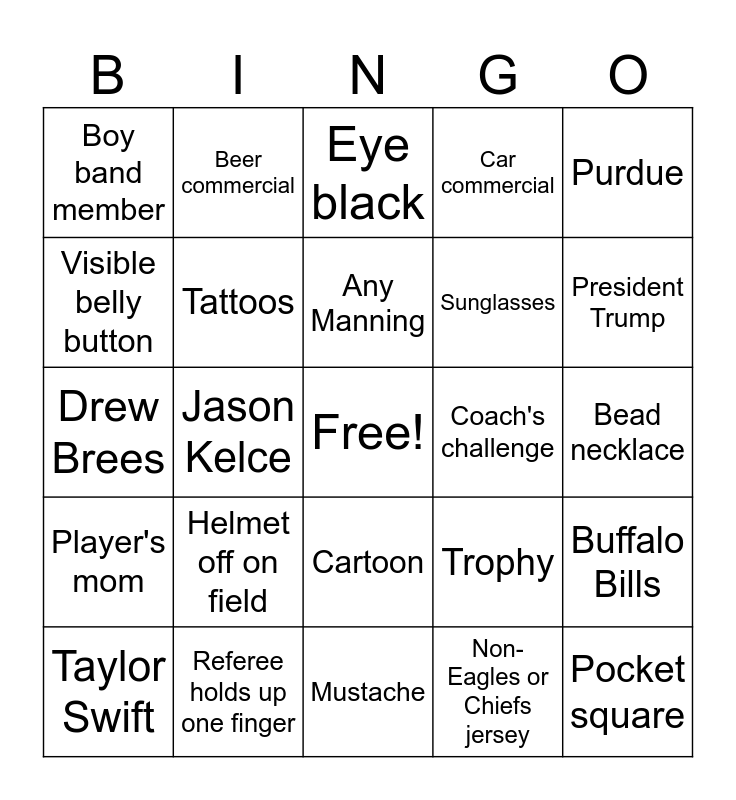 This bingo card has a free space and 29 words: Taylor Swift, Baby Mahomes, Jason Kelce, IndyCar, Boy band member, Eye black, Tattoos, Helmet off on field, Coach's challenge, Referee holds up one finger, Bead necklace, Pocket square, Mustache, Non-Eagles or Chiefs jersey, President Trump, Commissioner Goodell, Cartoon, Player's mom, Purdue, Drew Brees, Trophy, Fan eating food, Sunglasses, Visible belly button, Car commercial, Beer commercial, Buffalo Bills, Any Manning and Player drinking from a cup.