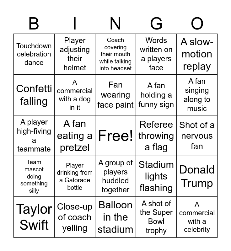 This bingo card has a free space and 24 words: Player drinking from a Gatorade bottle, Close-up of coach yelling, Fan wearing face paint, Taylor Swift, A slow-motion replay, Touchdown celebration dance, Confetti falling, Player adjusting their helmet, Referee throwing a flag, A group of players huddled together, A fan holding a funny sign, A player high-fiving a teammate, Stadium lights flashing, Donald Trump, A commercial with a dog in it, A shot of the Super Bowl trophy, Shot of a nervous fan, Coach covering their mouth while talking into headset, A fan singing along to music, A fan eating a pretzel, A commercial with a celebrity, Team mascot doing something silly, Words written on a players face and Balloon in the stadium.