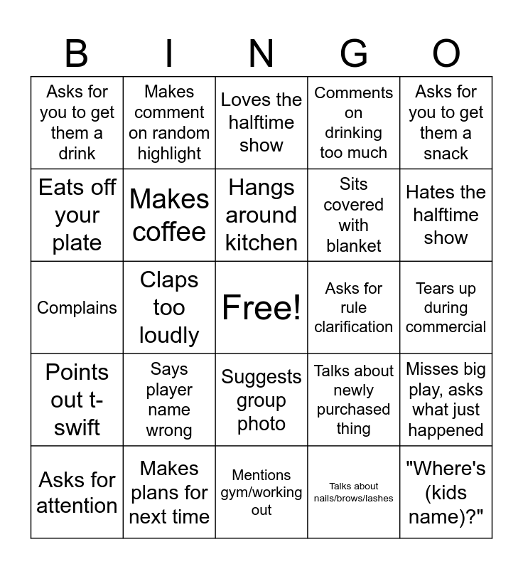 This bingo card has a free space and 24 words: Says player name wrong, Makes plans for next time, Hangs around kitchen, Asks for attention, Asks for you to get them a snack, Asks for you to get them a drink, Eats off your plate, Makes comment on random highlight, Asks for rule clarification, Suggests group photo, Sits covered with blanket, Complains, Talks about newly purchased thing, Misses big play, asks what just happened, Makes coffee, Talks about nails/brows/lashes, Tears up during commercial, Loves the halftime show, Hates the halftime show, Claps too loudly, "Where's (kids name)?", Points out t-swift, Comments on drinking too much and Mentions gym/working out.