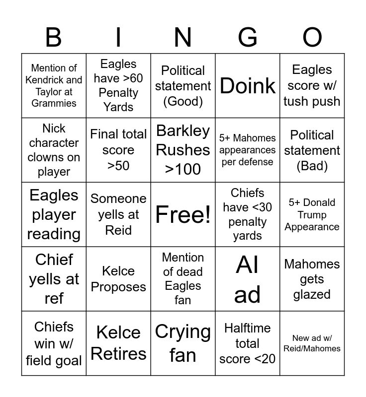 This bingo card has a free space and 24 words: Kelce Proposes, Kelce Retires, Barkley Rushes >100, Chiefs win w/ field goal, Eagles score w/ tush push, Mention of Kendrick and Taylor at Grammies, Nick character clowns on player, Eagles have >60 Penalty Yards, Chiefs have <30 penalty yards, Mention of dead Eagles fan, 5+ Mahomes appearances per defense, Eagles player reading, AI ad, Mahomes gets glazed, Final total score >50, Halftime total score <20, 5+ Donald Trump Appearance, Political statement (Good), Political statement (Bad), Someone yells at Reid, New ad w/ Reid/Mahomes, Chief yells at ref, Doink and Crying fan.