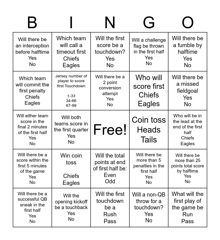 This bingo card has a free space and 24 words: Win coin toss Chiefs Eagles, Will the opening kickoff be a touchback Yes No, Will there be a 2 point conversion attempt Yes No, Will there be a successful QB sneak in the first half Yes No, Will there be a fumble by halftime Yes No, Will there be an interception before halftime Yes No, Which team will commit the first penalty Chiefs Eagles, Which team will call a timeout first Chiefs Eagles, Coin toss Heads Tails, Will the total points at end of first half be: Even Odd, Who will score first Chiefs Eagles, Will either team score in the final 2 minutes of the first half Yes No, Will there be more than 5 penalties in the first half Yes No, Will there be more than 25 points total score by halftime Yes No, Jersey number of player to score first Touchdown 1-33 34-66 67-99, Will a non-QB throw for a touchdown? Yes No, Who will be in the lead at the end of the first half Chiefs Eagles, Will the first score be a touchdown? Yes No, Will there be a missed fieldgoal Yes No, Will both teams score in the first quarter Yes No, What will the first play of the game be Run Pass, Will there be a score within the first 5 minutes of the game Yes No, Will a challenge flag be thrown in the first half Yes No and Will the first touchdown be a Rush Pass.