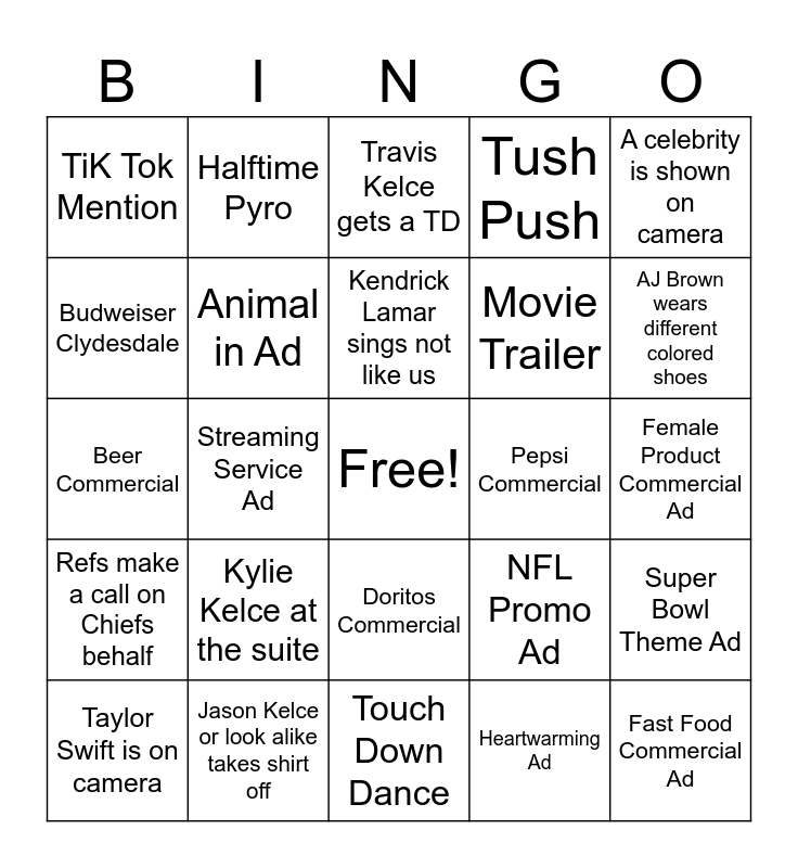 This bingo card has a free space and 24 words: Kylie Kelce at the suite, Jason Kelce or look alike takes shirt off, Kendrick Lamar sings not like us, Taylor Swift is on camera, A celebrity is shown on camera, TiK Tok Mention, Budweiser Clydesdale, Halftime Pyro, Pepsi Commercial, Doritos Commercial, Movie Trailer, Beer Commercial, NFL Promo Ad, Super Bowl Theme Ad, Animal in Ad, Heartwarming Ad, Female Product Commercial Ad, Travis Kelce gets a TD, AJ Brown wears different colored shoes, Streaming Service Ad, Fast Food Commercial Ad, Refs make a call on Chiefs behalf, Tush Push and Touch Down Dance.