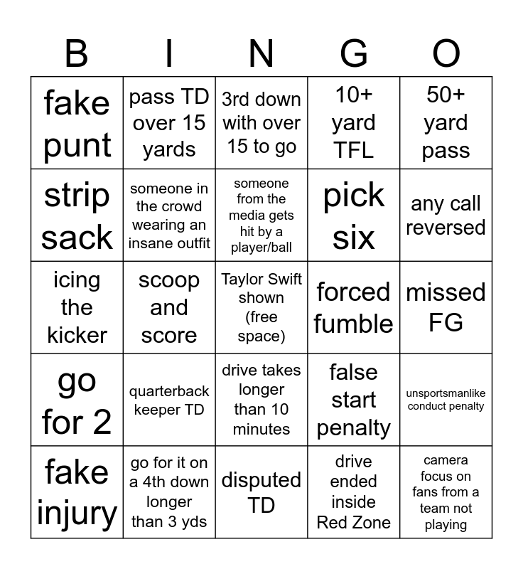This bingo card has a free space and 38 words: safety, camera pans to a fan crying, a helmet pops off, someone in the crowd wearing an insane outfit, unsportsmanlike conduct penalty, quarterback keeper TD, someone from the media gets hit by a player/ball, punt/kickoff return for TD, 50+ yard pass, pick six, scoop and score, 10+ yard TFL, camera focus on fans from a team not playing, missed FG, strip sack, go for 2, offensive PI called, 3rd down with over 15 to go, field goal made from 40+ yards, forced fumble, fake punt, go for it on a 4th down longer than 3 yds, any call reversed, fake injury, trick play, disputed TD, turnover on downs, 30+ yard run, coach freakout, 4th down conversion, scoring drive less than 4 plays, drive takes longer than 10 minutes, drive ended inside Red Zone, pass TD over 15 yards, missed PAT, false start penalty, icing the kicker and offsides.