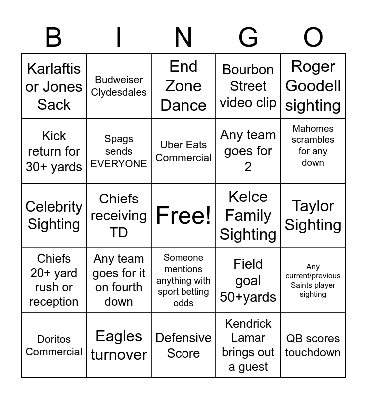 This bingo card has a free space and 29 words: Doritos Commercial, "3 Peat" Mention, Chiefs receiving TD, DOINK!, Karlaftis or Jones Sack, End Zone Dance, Spags sends EVERYONE, Any team goes for it on fourth down, Kelce Family Sighting, Eagles turnover, Taylor Sighting, QB scores touchdown, Defensive Score, Kendrick Lamar brings out a guest, Mahomes scrambles for any down, Audible "Chiefs" during National Anthem, Someone mentions anything with sport betting odds, Chiefs 20+ yard rush or reception, Roger Goodell sighting, Celebrity Sighting, Field goal 50+yards, DHop, Hollywood Brown, or Kareem Hunt TD, Any team goes for 2, Kick return for 30+ yards, Bourbon Street video clip, Budweiser Clydesdales, Any current/previous Saints player sighting, Uber Eats Commercial and River Boat video clip.