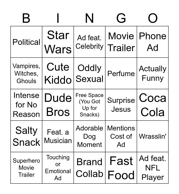 This bingo card has a free space and 44 words: Nostalgic Reference, Ad feat. NFL Player, Dramatic Voiceover in Car Commercial, Superhero Movie Trailer, Beer, Fast Food, Ad feat. Celebrity, "To Be Continued", Phone Ad, Touching or Emotional Ad, Movie Trailer, Surprise Jesus, Adorable Dog Moment, Feat. a Musician, Streaming Service Ad, Brand Collab, Punny, Intense for No Reason, Wild Wild West(ern Setting), Actually Funny, Star Wars, Dancing, USA! USA! USA!, Political, Athlete with a Message, Coca Cola, Candy, Tone Deaf, Mentions Cost of Ad, Salty Snack, Unexpected Celeb Cameo, Wrasslin', Rivalry, Tourism Ad, Dude Bros, Clearly Gen-Z Coded, Appeals to The Olds, Nonsense Luxury Good, Oddly Sexual, Vampires, Witches, Ghouls, Perfume, Stereotypical Husband/Wife, Cute Kiddo and Talking Animal.
