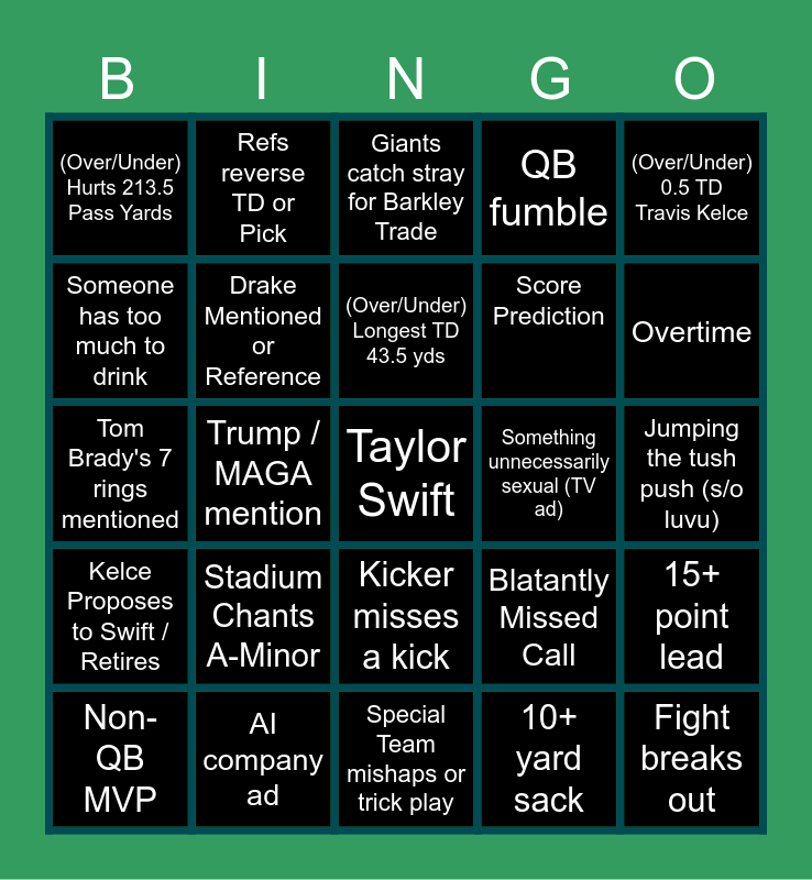 This bingo card has a free space and 34 words: Kendrick brings out a 3rd surprise guest, Saquon Barkley 20+ yd touchdown, Jesus ad, Three-peat, Jumping the tush push (s/o luvu), Someone has too much to drink, Drake Mentioned or Reference, Special Team mishaps or trick play, Score Prediction, Fight breaks out, Tom Brady's 7 rings mentioned, Refs reverse TD or Pick, 10+ yard sack, Chief Defensive Pass Interference, Kelce Proposes to Swift / Retires, Trump / MAGA mention, Kicker misses a kick, Something unnecessarily sexual (TV ad), 15+ point lead, Non-QB MVP, AI company ad, Patrick Mahomes throws a side arm pass, QB fumble, Overtime, Compare Mahomes to Brady, Stadium Chants A-Minor, Giants catch stray for Barkley Trade, (Over/Under) 24.5 points at halftime, (Over/Under) 0.5 TD Travis Kelce, (Over/Under) Hurts 213.5 Pass Yards, (Over/Under) AJ Brown 5.5 Receptions, (Over/Under) Longest TD 43.5 yds, Blatantly Missed Call and Blue Tent Appearance.